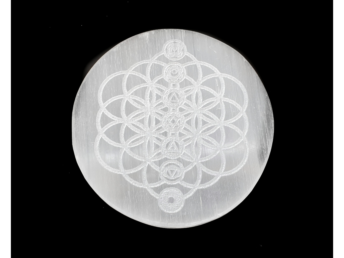 Esta placa de selenita tiene una forma circular, el símbolo que tiene grabado es de los 7 chacras.